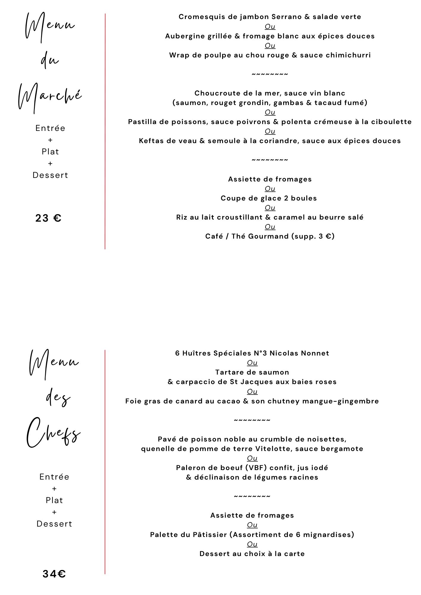 Le restaurant propose une cuisine du marché, mettant à l’honneur des produits frais, locaux et de saison. La carte, renouvelée régulièrement, offre des plats savoureux tels que des coquilles Saint-Jacques de la Baie de Saint-Brieuc, des mets végétariens et des spécialités régionales françaises. Les desserts, créatifs et gourmands, complètent parfaitement le repas.